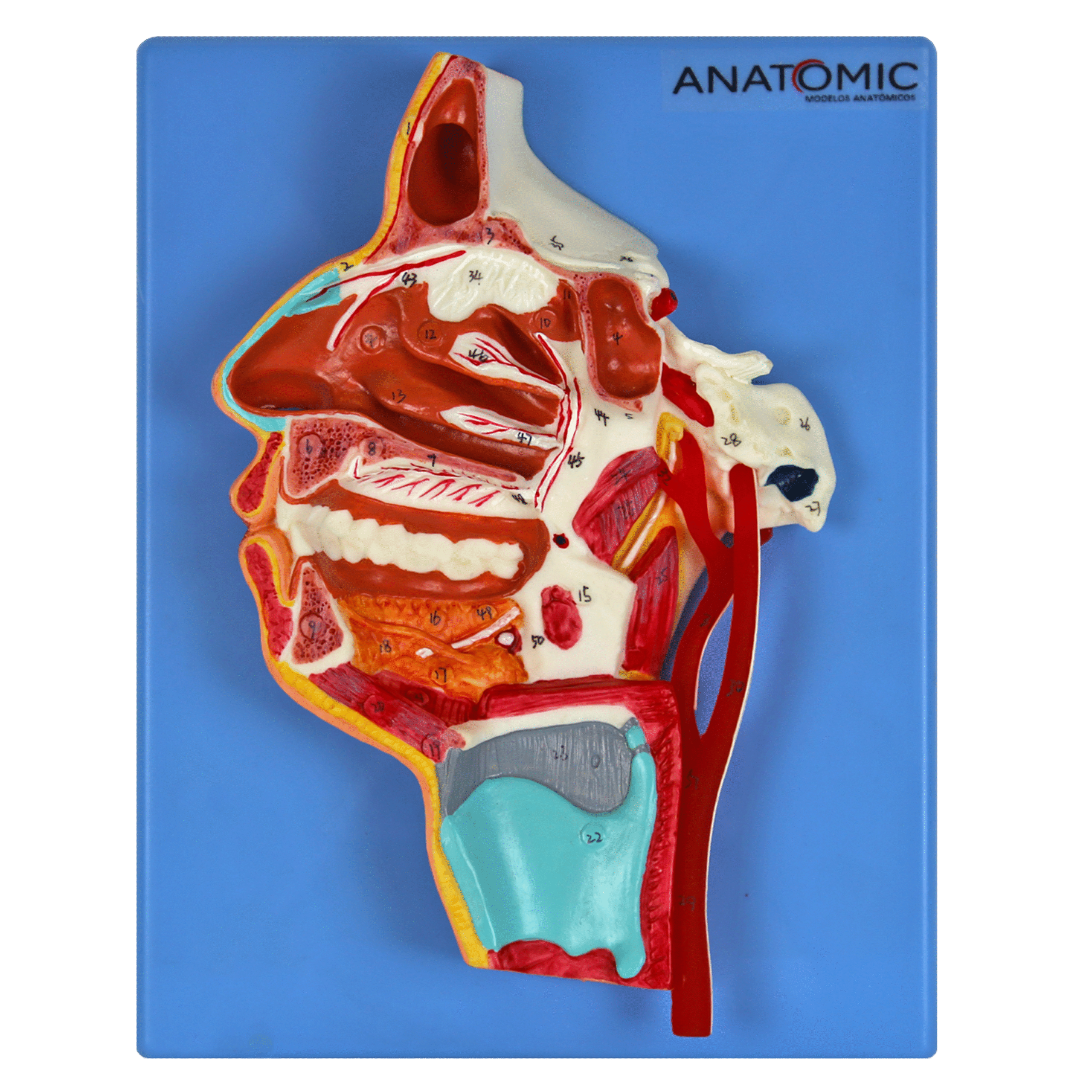 Modelo anatômico da boca, nariz, faringe laringe, mostra as partes internas da cavidade óssea da face, cavidade oral com dentes, cavidade nasal, laringe, faringe nervos e músculo, com pontos numerados para estudo. Confeccionado em resina plástica, montado sobre placa.