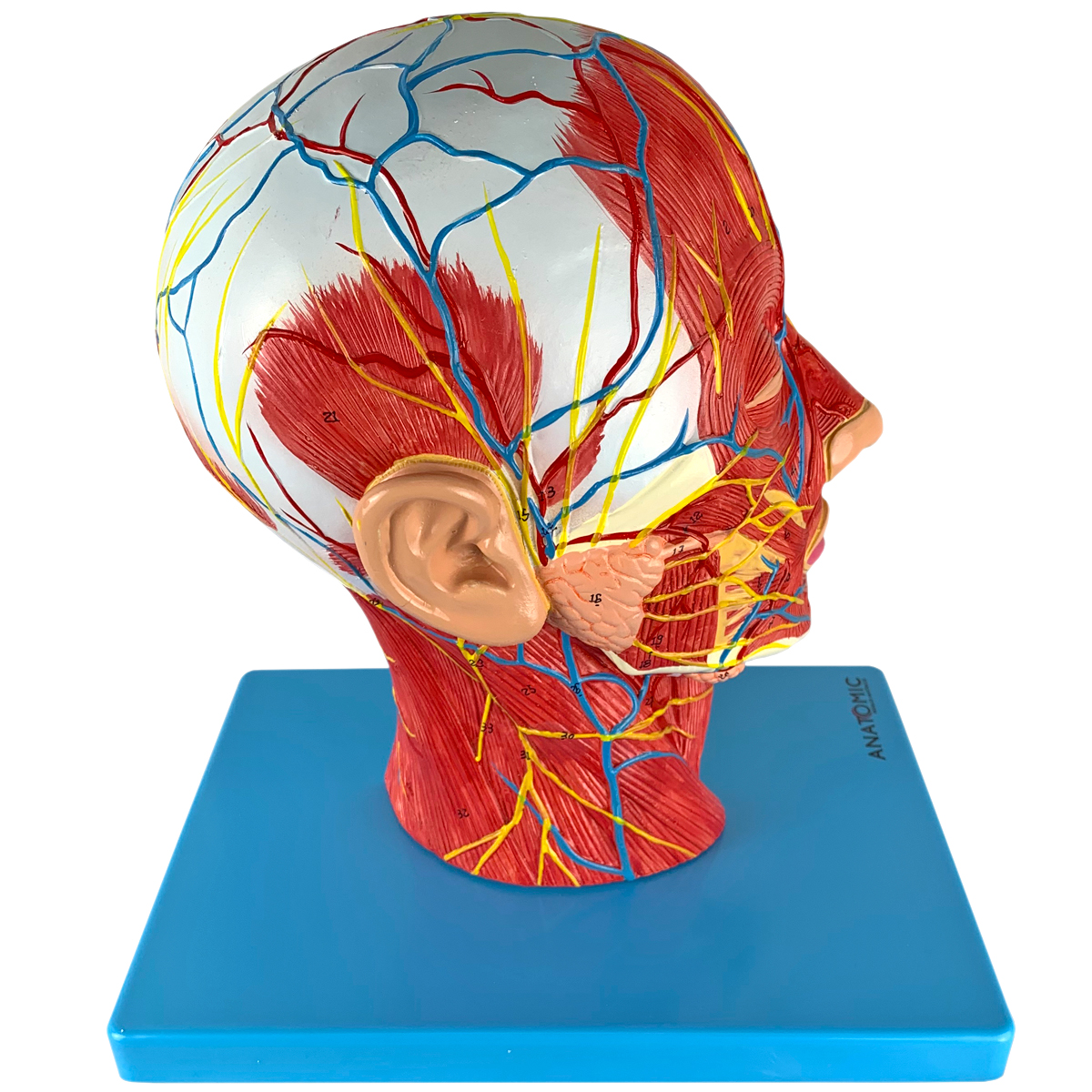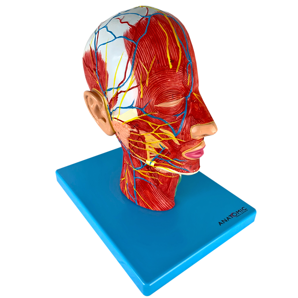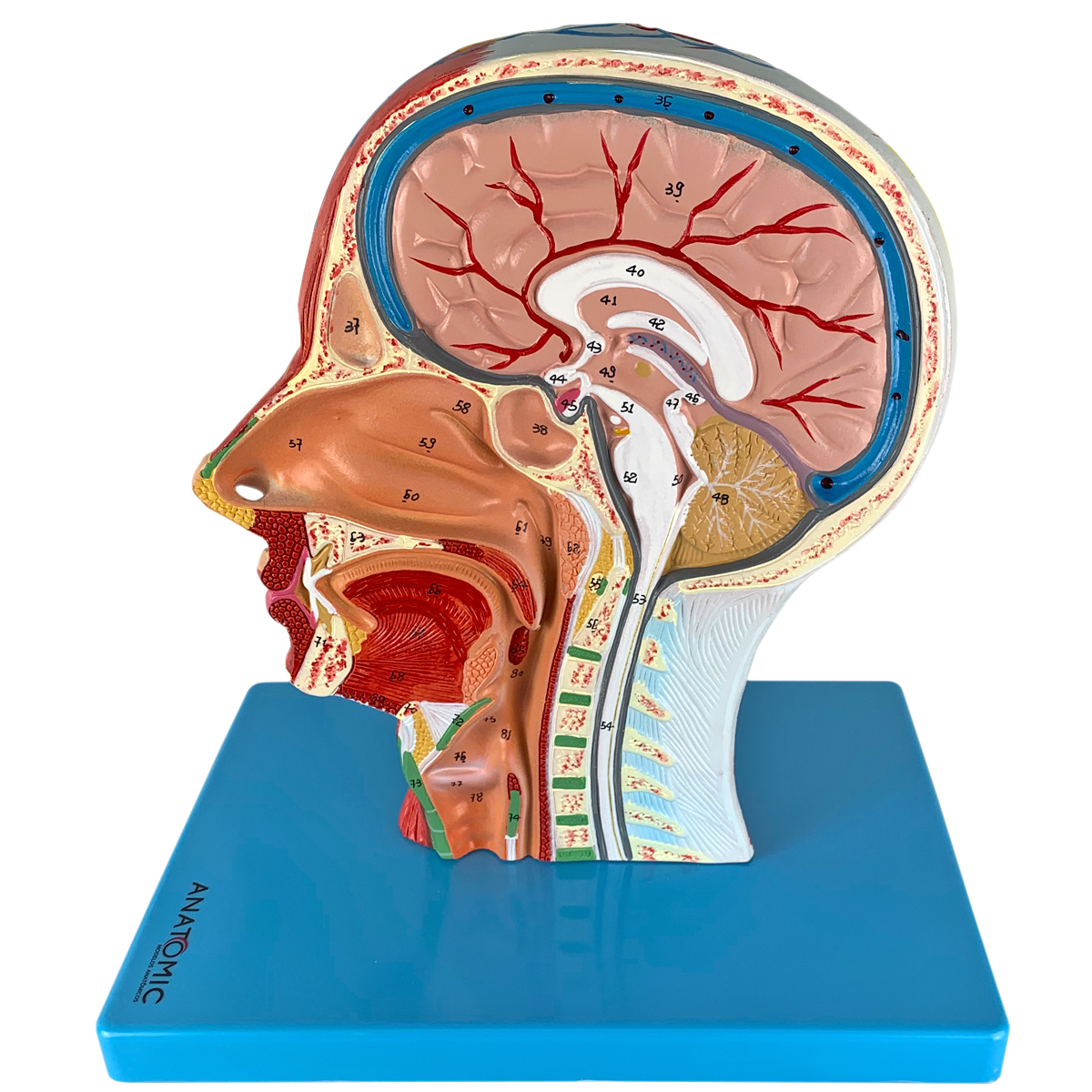 Modelo de cabeça com corte sagital – lado direito, mostra com riqueza de detalhes estrutura muscular superficial externa, com vasos sanguíneos e ramificações nervosas; mostra também estrutura interna da cabeça, evidenciando o cérebro, cerebelo, medula espinhal, cavidade nasal, palato e partes adjacentes, 82 pontos numerados e confeccionado em resina plástica. Montado sobre base.
