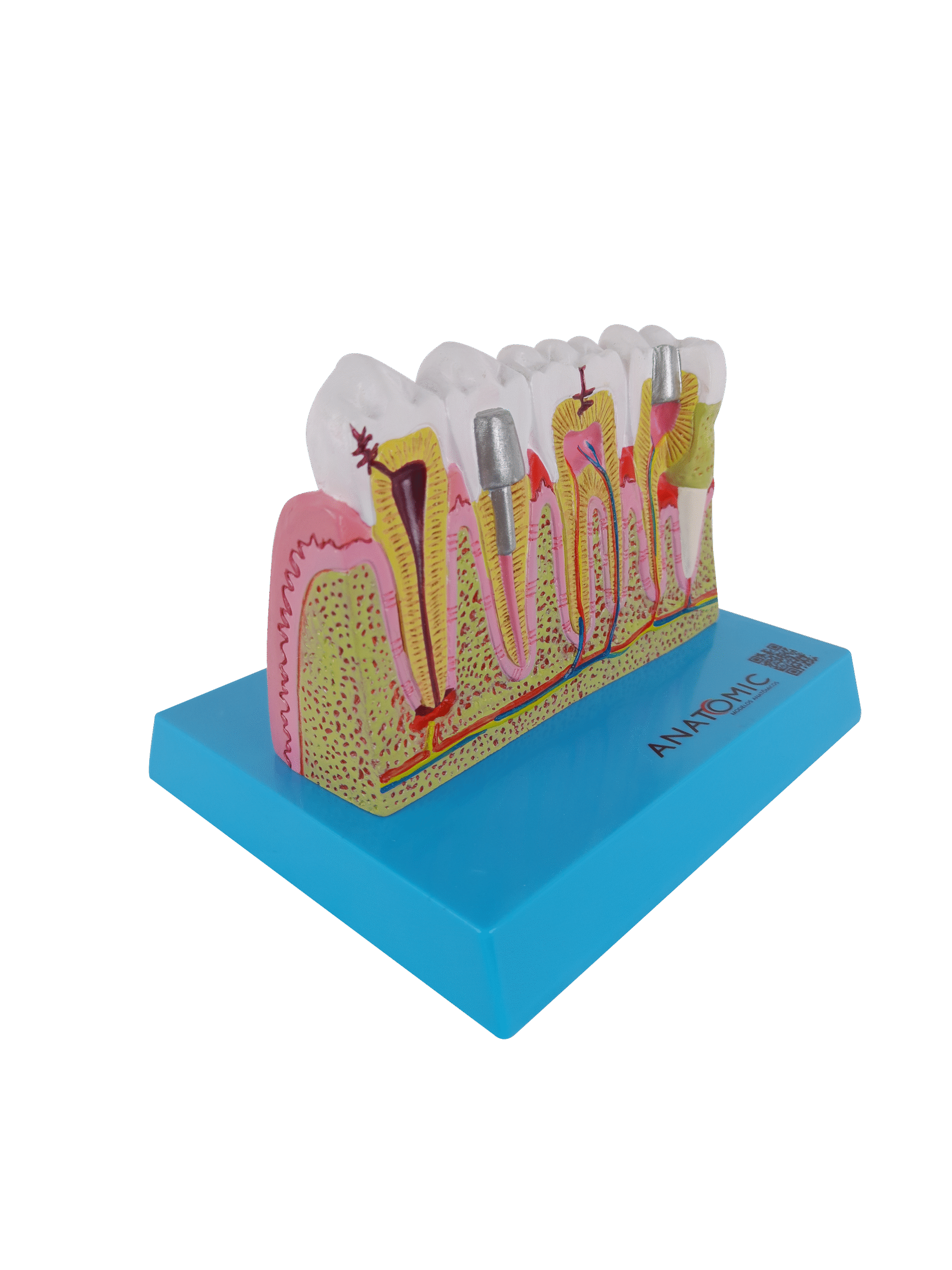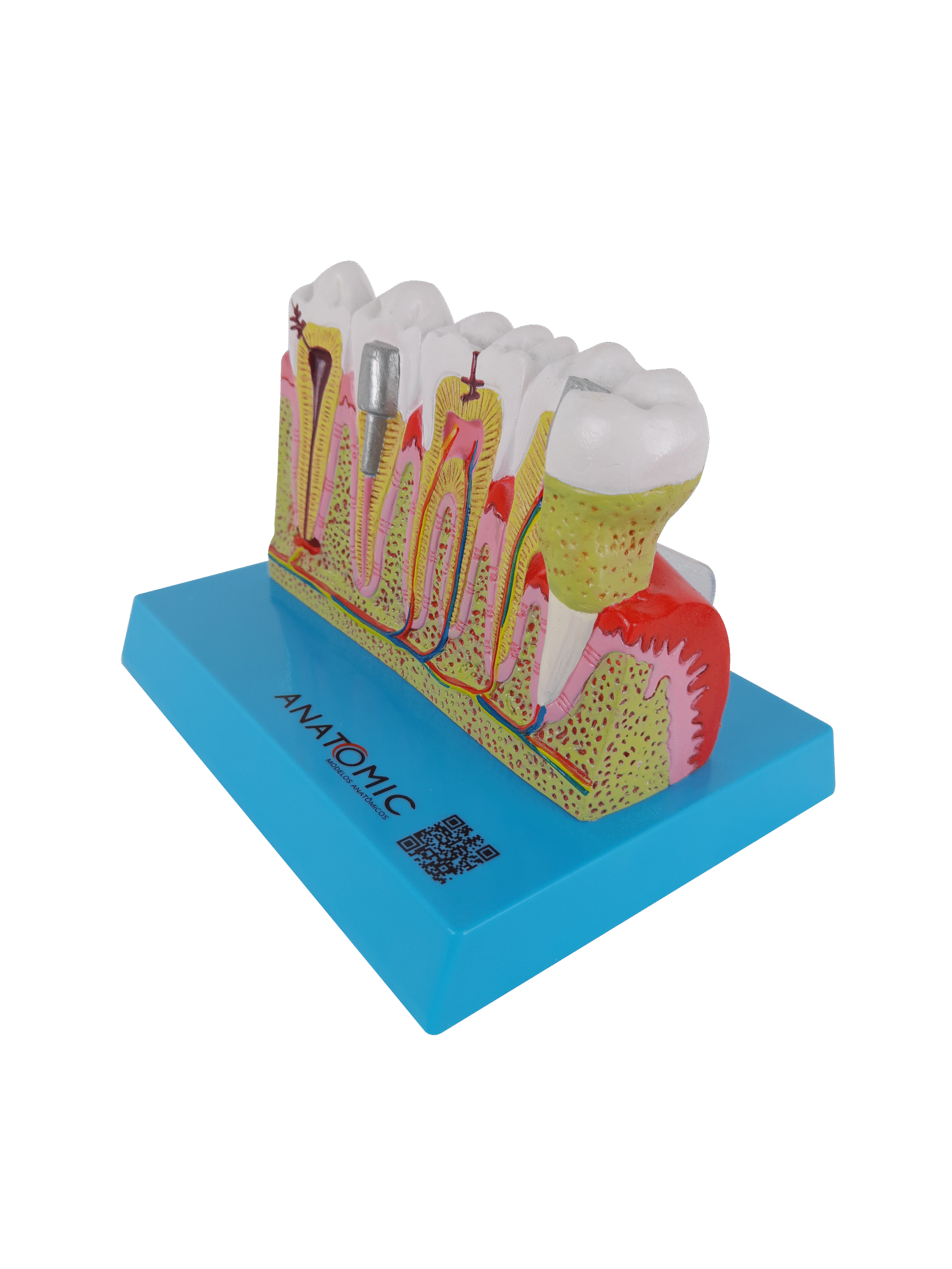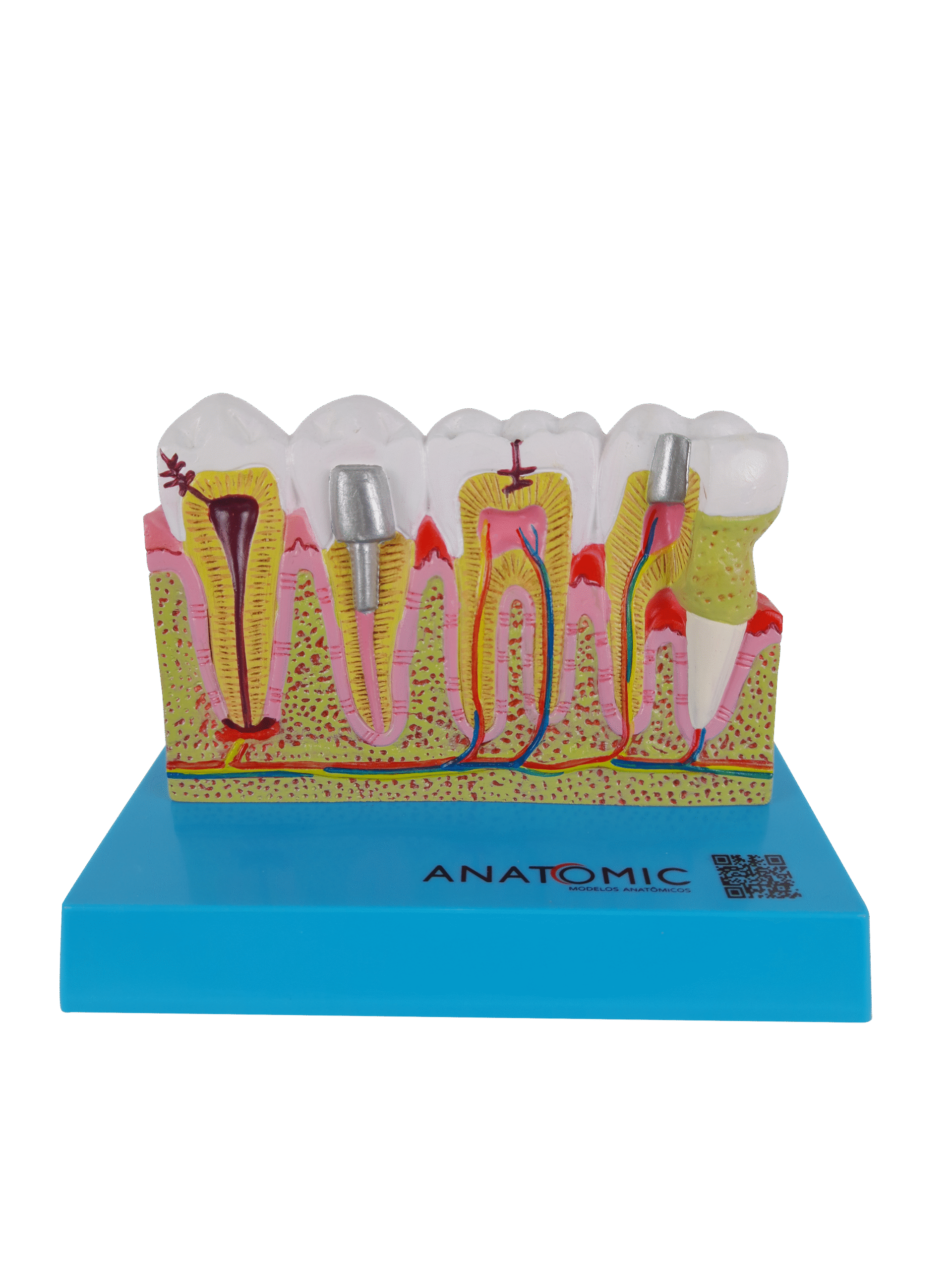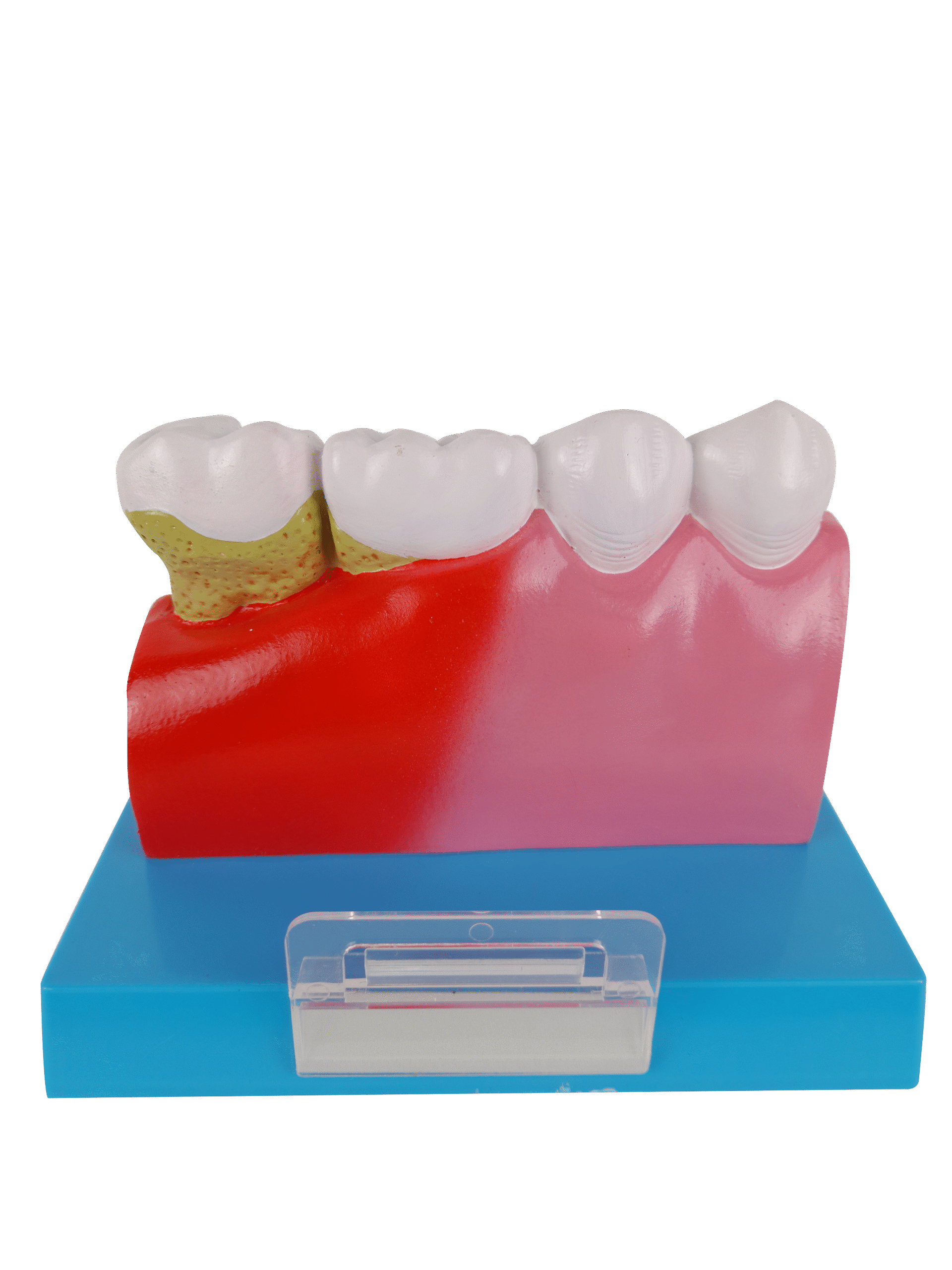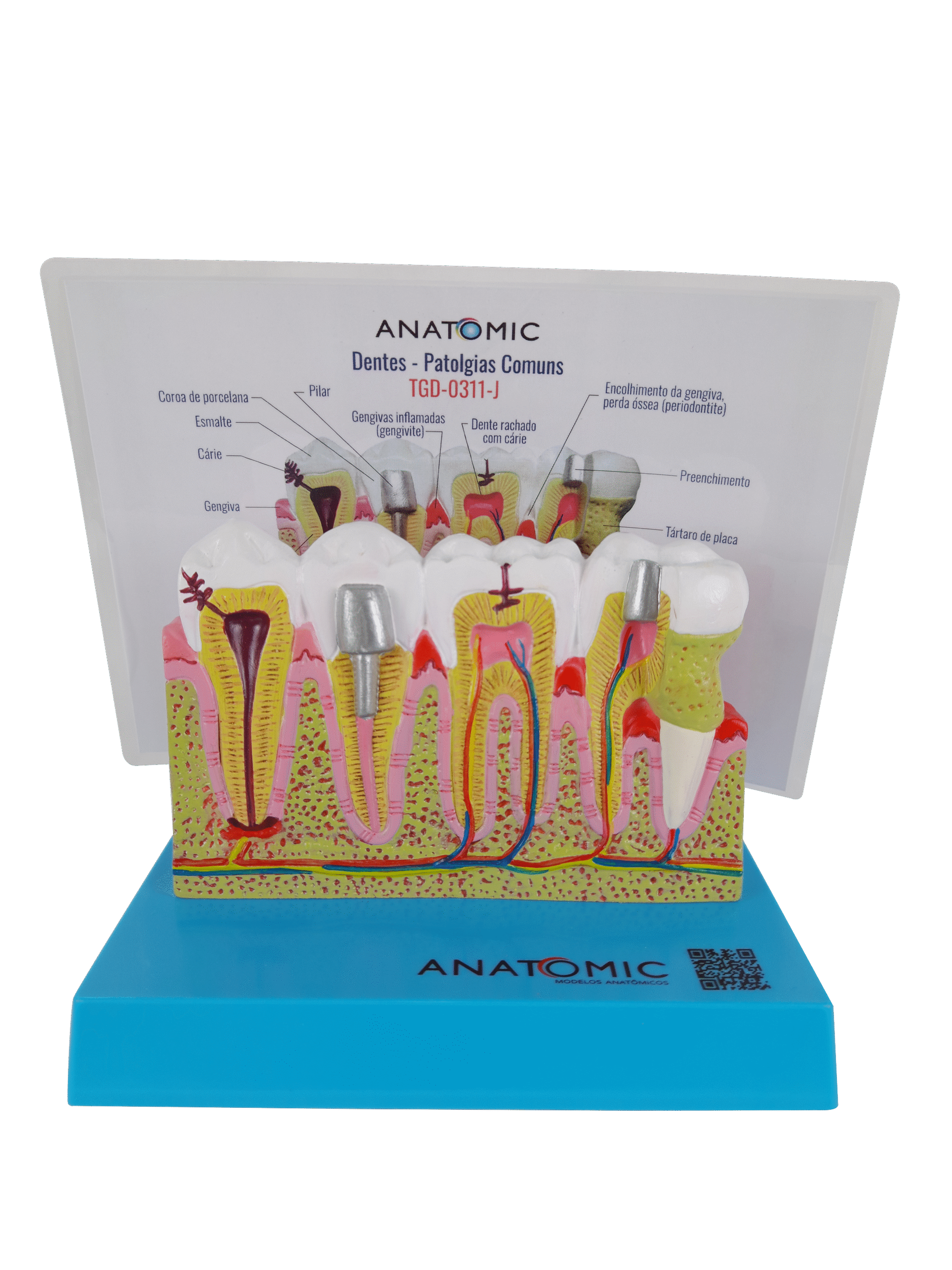 Modelo exibe dentes e gengiva acometidos por patologias comuns, classificados em prancha explicativa. Confeccionado nem resina plástica rígida, montado sobre base.