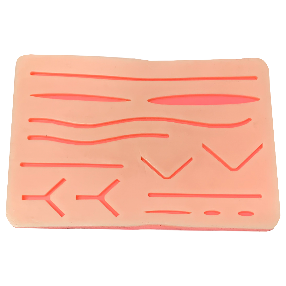 Simulador de pele desenvolvido para treinamento e demonstração dos diferentes tipos de sutura, com 14 cortes, em diferentes tipos e profundidades, o simulador possui gordura e músculos. Proporcionando assim uma simulação realística. É portátil e fácil de transportar, ideal para estudantes de medicina, enfermagem e aprimoramento profissional na área da saúde. Confeccionado em poli elastômero.